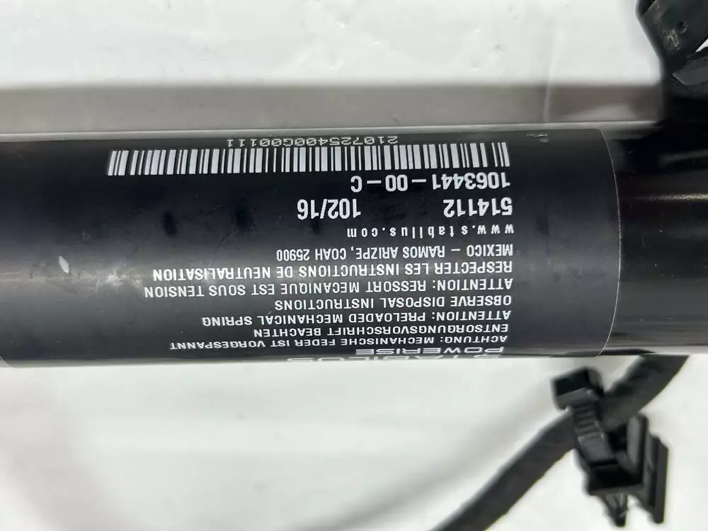 Оригінальний лівий короткий амортизатор задньої двері для Tesla Model X. OEM-номер: 1063441-00-C. Запчастина у відмінному технічному стані, знята з авто без пошкоджень або втрати тиску. Корпус не має слідів корозії чи деформації, шток чистий, не підтікає.