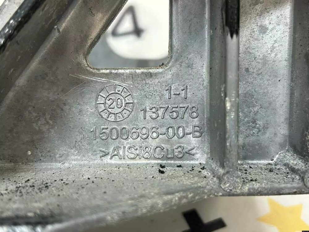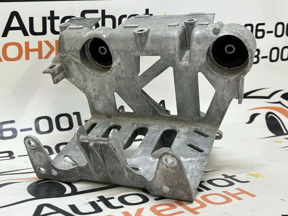 Оригінальний кронштейн компресора кондиціонера в електромобілях Tesla Model Y тримає низьковольтний акумулятор та кліматичну установку. Деталь має артикул 1500696-00-B і є вживаною, але з повністю збереженими сайлентблоками — без тріщин, зносу чи деформацій.
