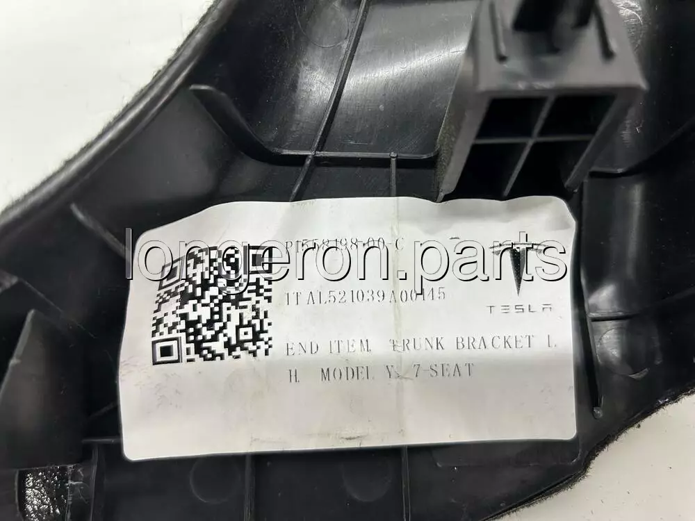 Оригінальна ліва обшивка лонжерона багажного відсіку Tesla Model Y у комплектації на 7 місць. OEM-номер: 1558198-00-C. Елемент виконаний з міцного пластика з заводською текстурою, посадкові отвори під кліпси збережені.