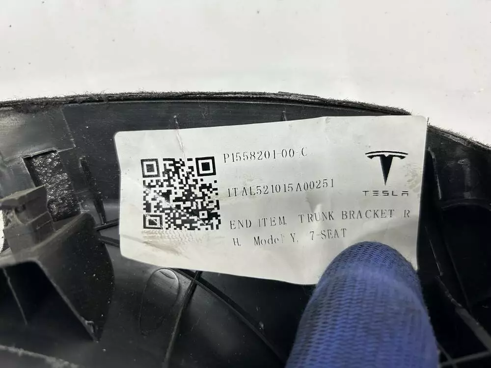 Оригінальна обшивка правого лонжерона багажного відділення Tesla Model Y у 7-місній комплектації. OEM-номер: 1558201-00-C. Елемент виготовлений з формованого текстурованого пластику, з акуратно оформленими краями та заводськими отворами для кліпс.