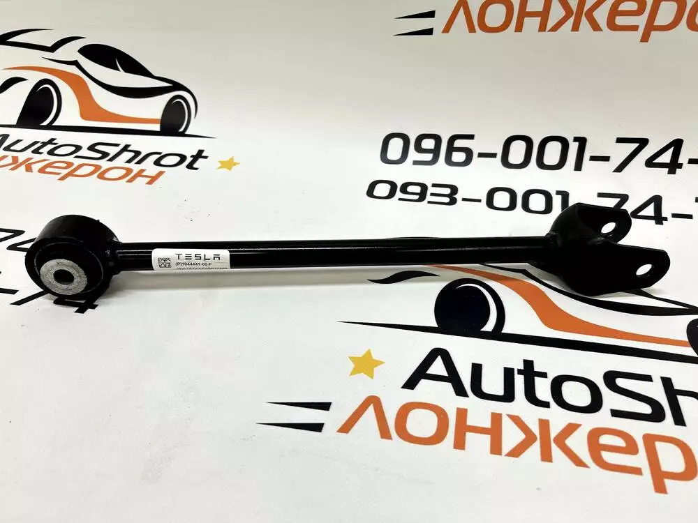 Оригінальний поздовжній важіль задньої підвіски Tesla Model Y, OEM-номер 1044441-00-F. Встановлюється в нижній частині задньої осі та відповідає за збереження правильного положення колеса при навантаженнях та під час руху.