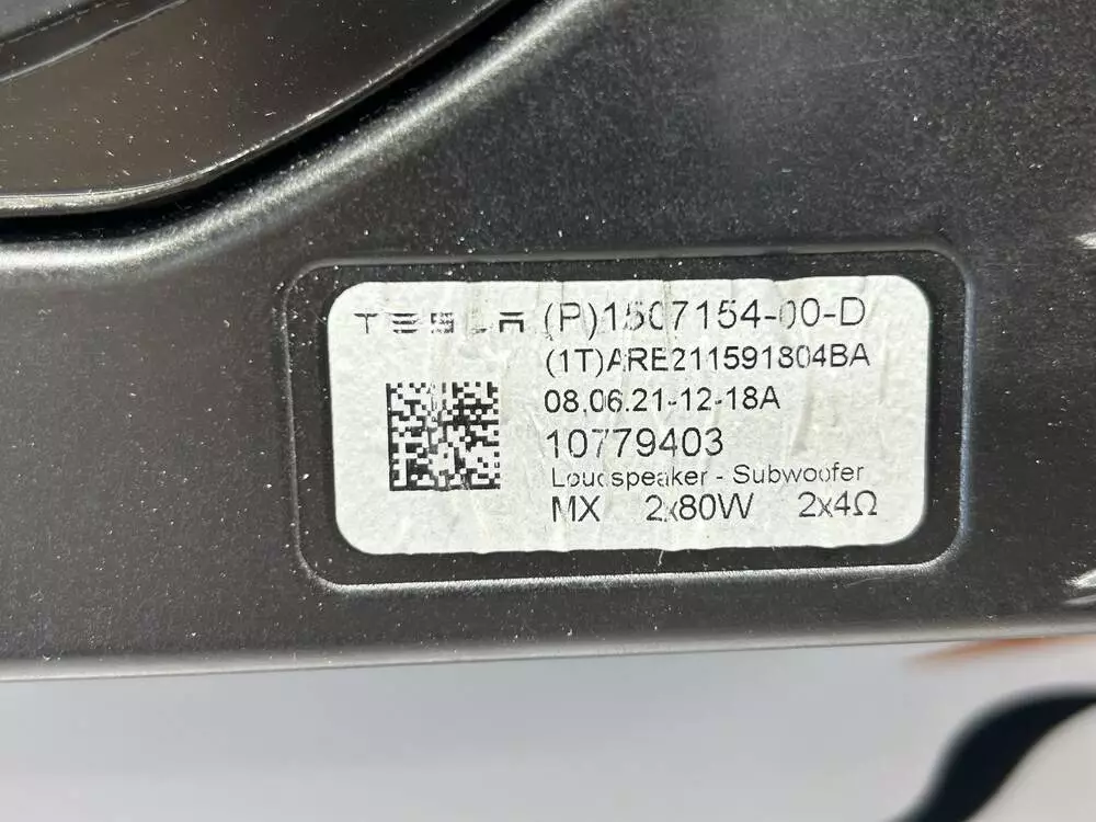 Оригінальний сабвуфер (басовий динамік) для Tesla Model Y, номер деталі – 1507154-00-D. Демонтований із авто з розширеною аудіосистемою. Відповідає за глибоке й чисте відтворення низьких частот. Деталь у відмінному стані – динамік не пошкоджений, корпус не має тріщин або втручань. Під’єднується через штатний роз’єм і повністю готовий до встановлення.